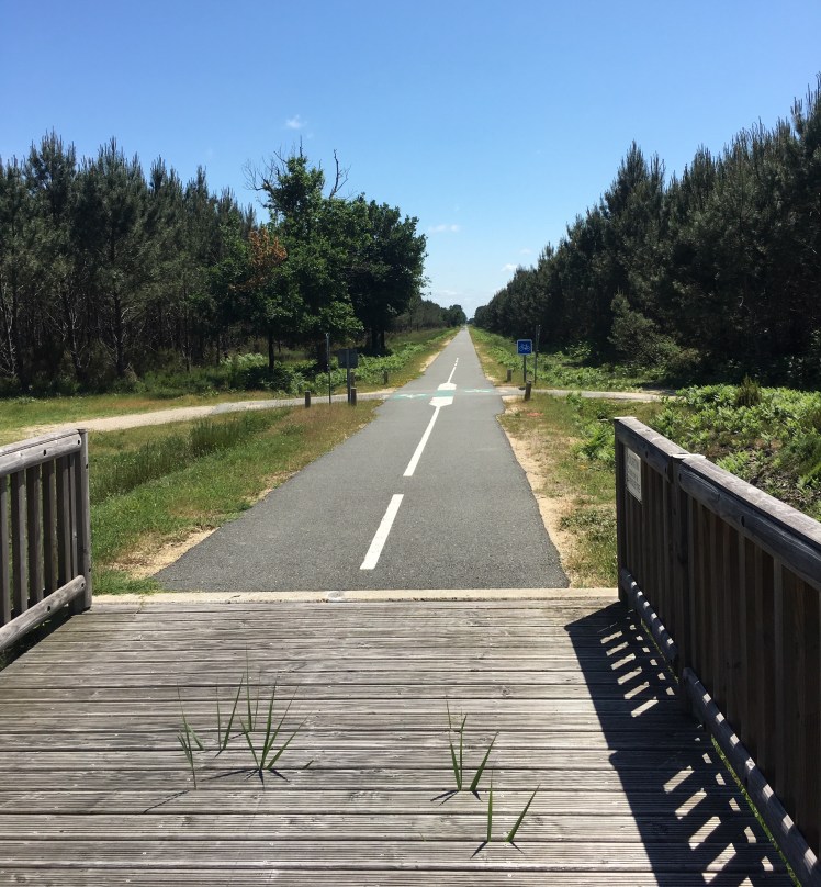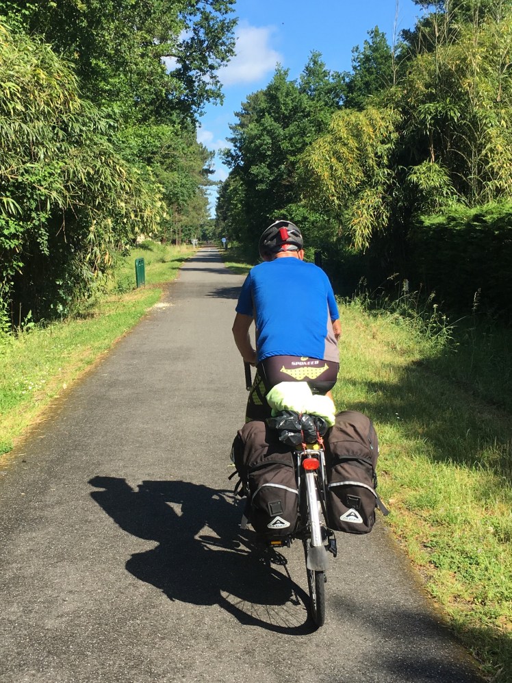 We left Biganos by some minor roads, but soon came across a railway path that would lead us right past our breakfast stop in Lege and onto lunch in Lacanua. Both taken on the comfort of park benches. At least we also had blue skies for the first time in a few days.