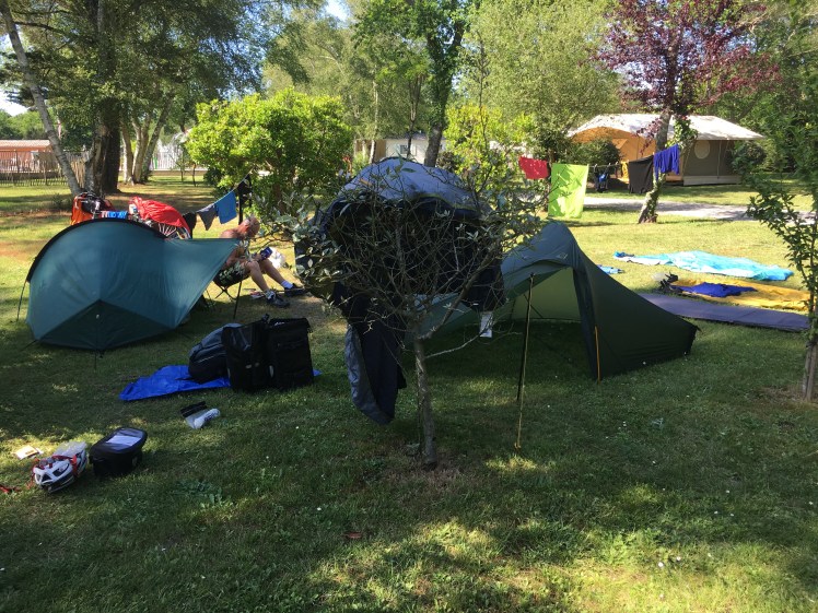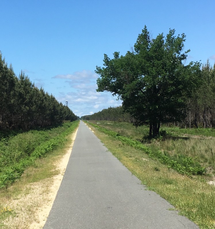 We were both feeling a bit tired and fancied a short day. Tim needed to dry out some things that got wet in yesterday’s downpour and I was keen to air my kit as some was getting damp. The tents hadn’t really had chance to dry either. Turned out the old train track went all the way to Hourtin- around 45 miles. Most of it dead straight. Sadly as for most of this trip, the wind was not helpful !