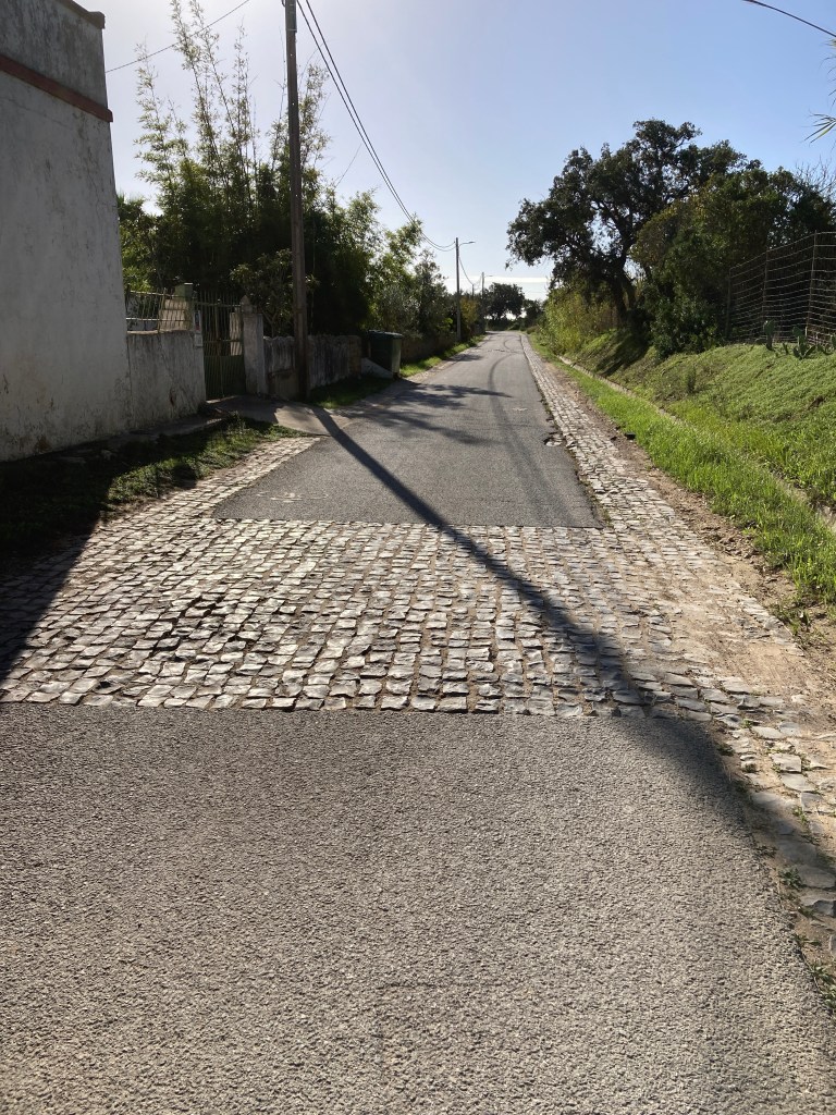 My joy at hitting tarmac was short lived, as in order to frustrate Brompton riders, the road builders had put cobbled rumble strips every few hundred metres.