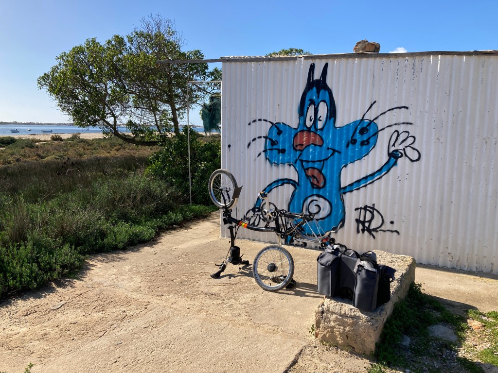 So I found a convenient spot and got on with it. It’s the first time I’ve changed the tube on a Brompton, for those unfamiliar with these bikes, it’s not as straightforward as on a “normal” bike as you have to partially dismantle the gears, taking off the chain tensioner and part of the hub gears. As it happens, it went fairly smoothly, but it was another half hour gone. I was now running out of time, but would still be ok if I put the hammer down. It was 10km to Faro and all on roads, I’d had my three bits of bad luck so I’d be fine !