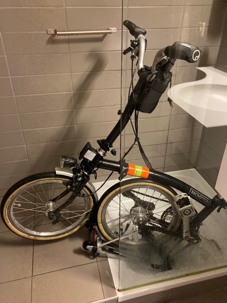 The hotel didn’t have any bike parking, but I explained I could fold the bike and take it to the room. Fortunately, the Brompton in all it’s mud covered glory was hidden outside, otherwise I think it would have been a “non” !