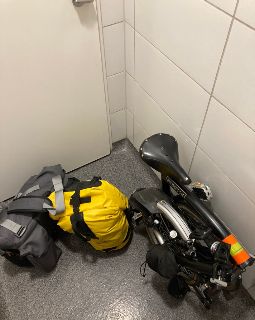 By the time I got to Duisburg, I needed to attend to a call of nature. After searching the station, I found the loos, where you had to pay a euro to “spend a penny” . The dilemma though was what to do with the bike ? Even if I’d wanted to lock it, there was nothing to lock it too. Fortunately with a Brompton that’s less of a problem, a quick fold and bike and bags were in. Being unisex, it was all cubicles, so required a little bit of manoeuvring to fit in ! It was a relief when it did !