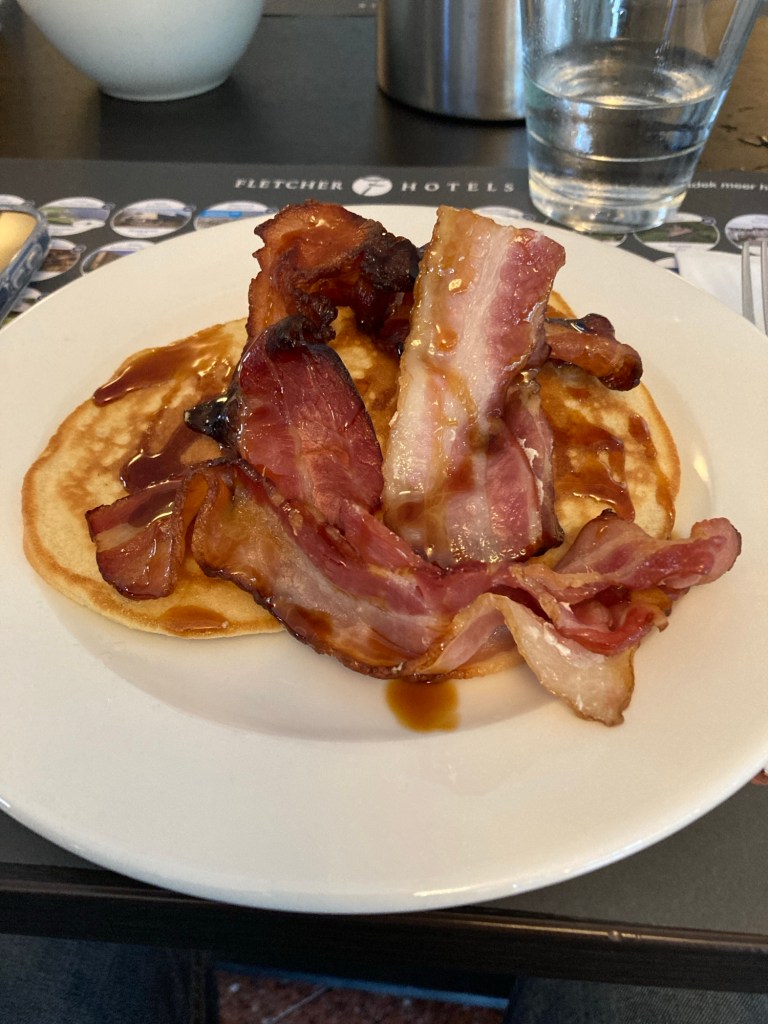 I decided to have a big breakfast, so as well as the healthy yoghurt and granola snd the assorted pastries, I decided not to pass up the chance of a stack of pancakes and bacon.