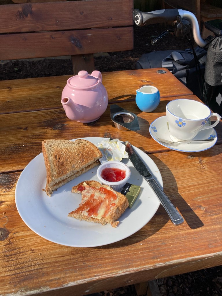 I was on the lookout now for somewhere to get some snacks, at least in the UK there are normally plenty of small convenience shops. I’d barely gone 5km though when I saw two cyclists sat by a small building, slowing down it turned out to be a little tea room and it had opened early – a bit of luck.