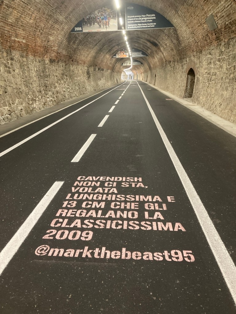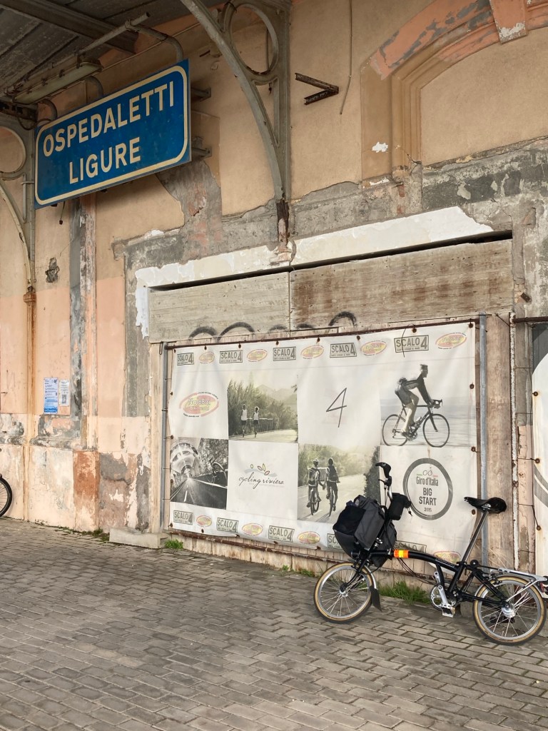 The rail trail has been created along what was the old track which hugged the coast. The new railway runs mainly underground, as a result, Sanremo station has been constructed deeper in a mountain than Dr Evil‘s secret lair, escaping it involved the longest passageway imaginable with multiple moving walkways. A new experience for the Brompton. I gave up after the second one, as these were clearly working on Italian time and barely crawled along.