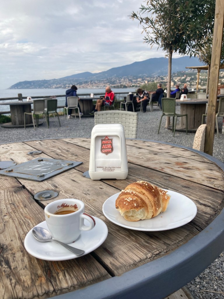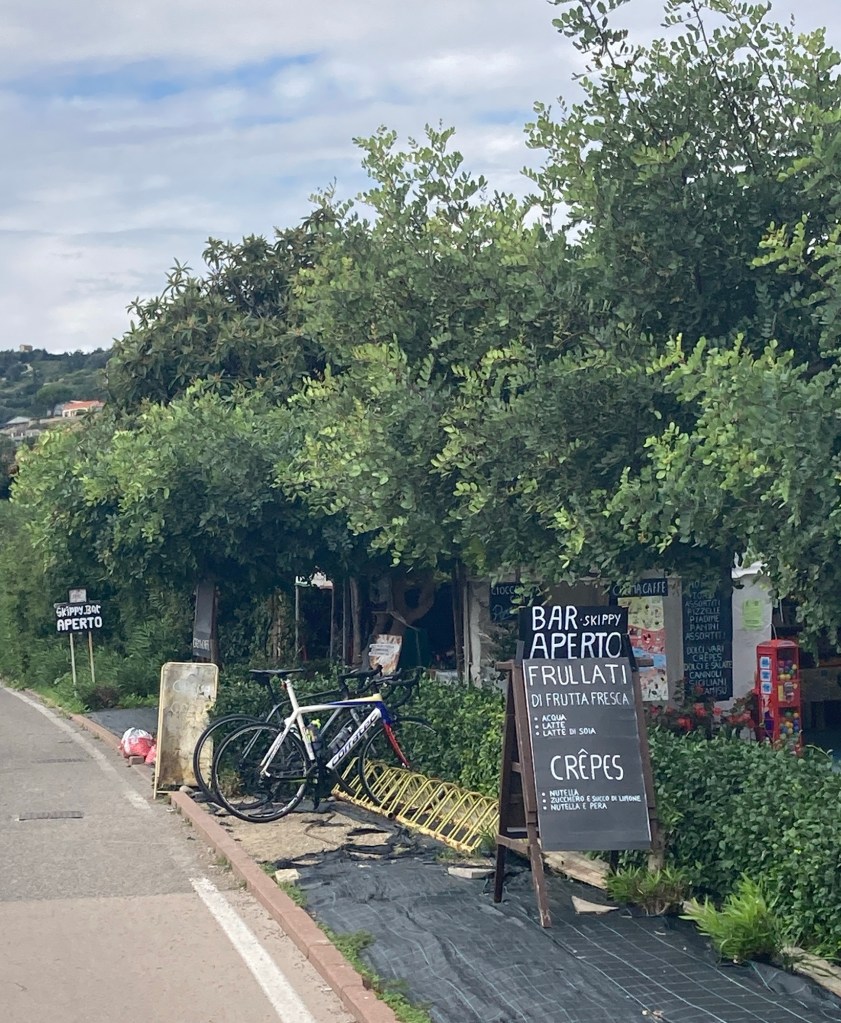 I decided to head back rather than go into town. Firstly I’d spotted a cafe a few km back and secondly it had started to rain on and off. Looking back towards Sanremo I could see what looked like heavy rain.