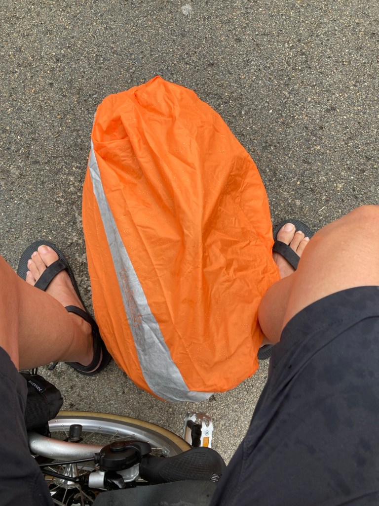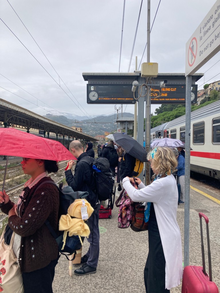My good luck lasted all the way to Sanremo, where I had a 30 minute wait for the train. Of course now was the time for the heavens to open ! Time to don a rain jacket for me and the Brompton bag.