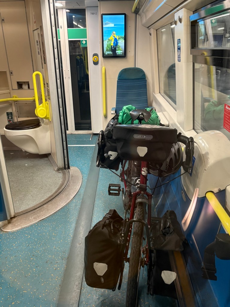 Soon I was nicely settled in on the train, bike parked up, conveniently close to the toilet, the door of which seemed to be stuck open. Fortunately the guard fixed it a bit later.