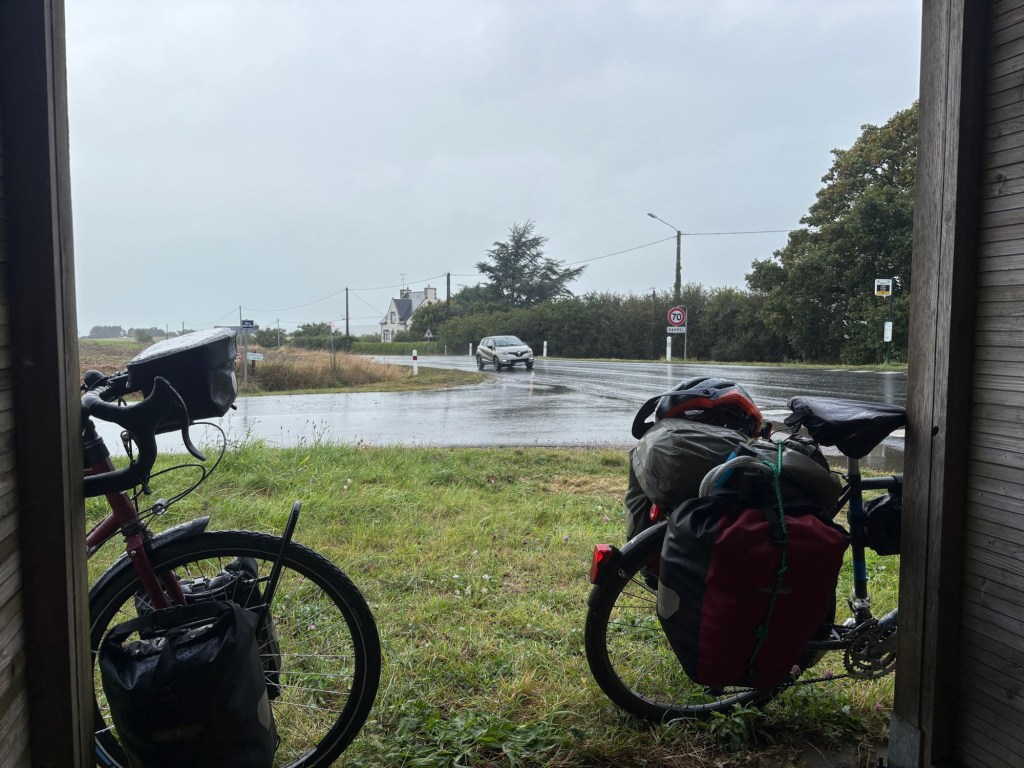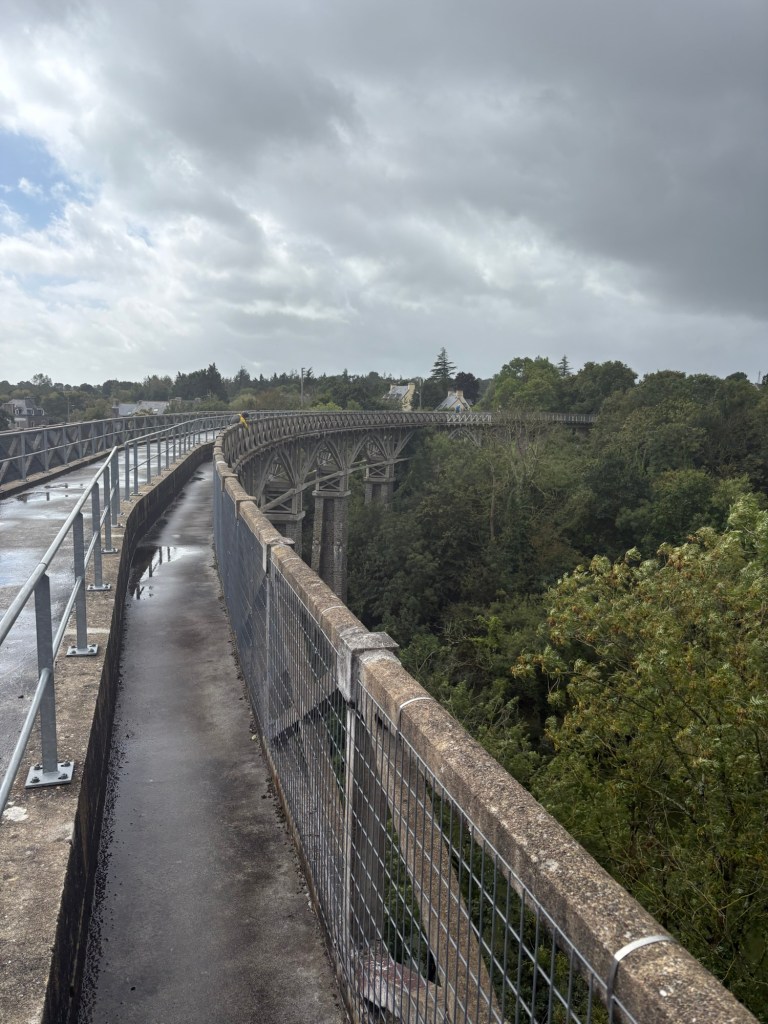 Souvenir photos taken we headed off. The rest of the day was more of the same, but with the added bonus of my GPS giving up, along with my will to live. Life improved after another visit to a patisserie, but it wasn’t a pleasant day. We did have one highlight, with the cycle track passing over an impressive old viaduct and of course we had the chance to evaluate Brittany’s bus shelters. Note to the council – the old wood ones offer the best shelter, but they all need seats.