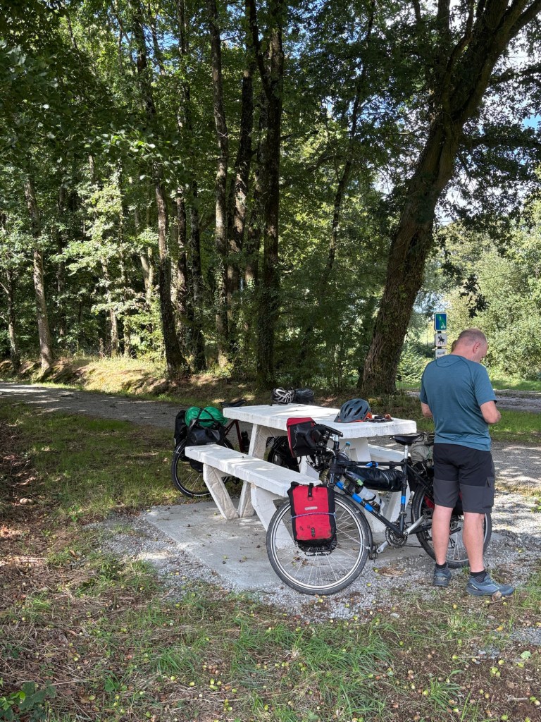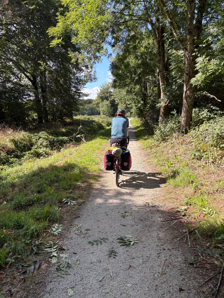 With 7km to go, we hit the Nantes- Brest canal, which would provide an almost flat route to Pontivy, our stop for the night. It looked lovely in the sun, maybe not so good when we had to hide from the rain.
